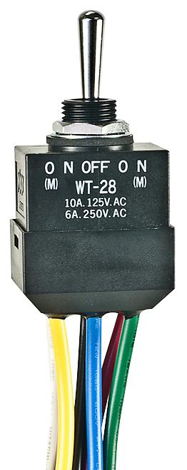 NKK Switches - WT28L - Toggle Switch,Sealed,DPDT,(ON)-OFF-(ON),Bat Actuator,10A,125VAC,Wire Lead - Allied Electronics & Automation, part of RS Group