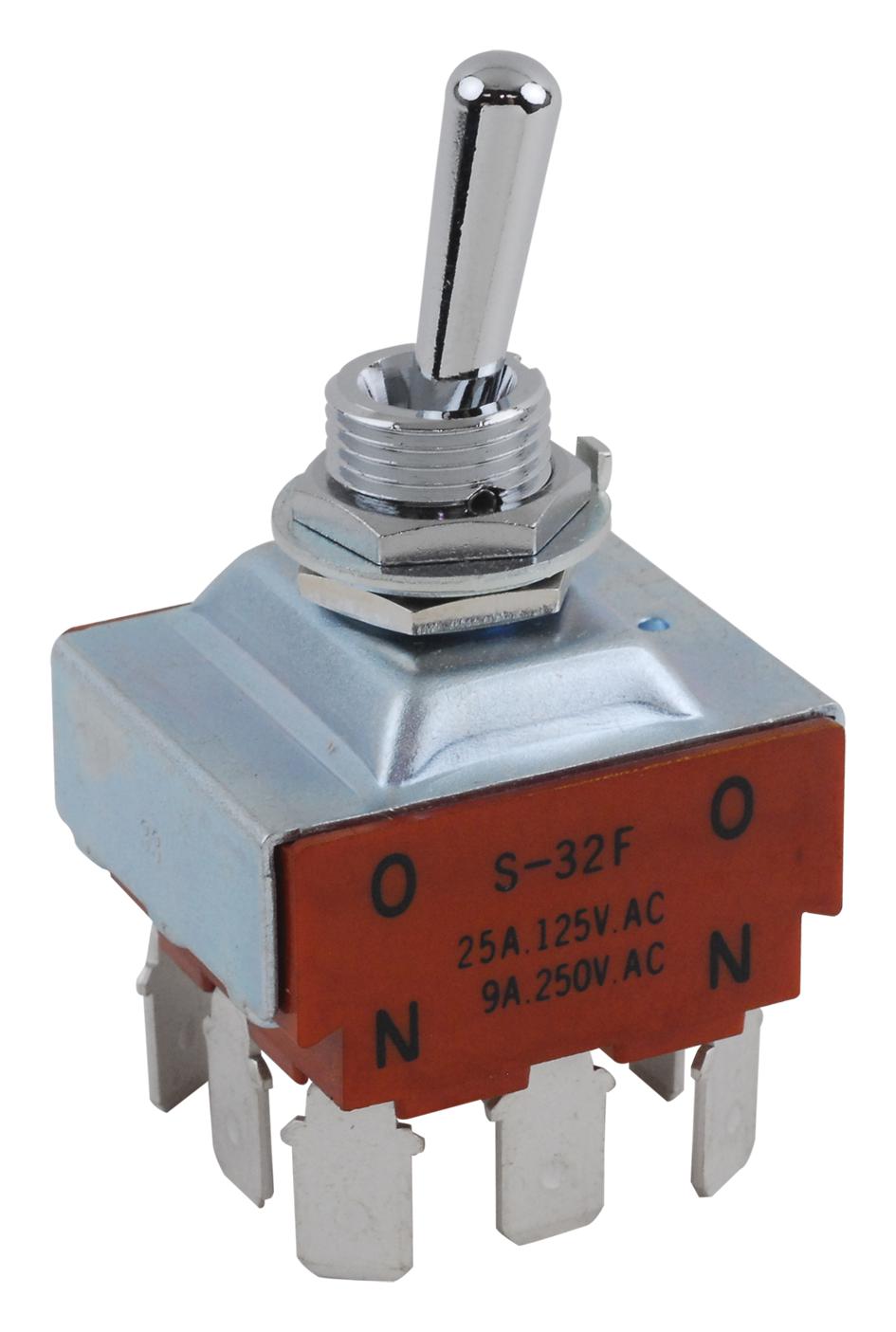 NKK Switches - S32F - Toggle Switch,3PDT,ON-NONE-ON,Non-Illum,17.50mm Actuator,20A,125VAC,.250" QC - RS