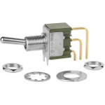 | Feature | <b>Price For:</b> Pack of 50 <b>Manufacturer</b>: NKK Switches <b>Product Category</b>: Toggle Switches <b>RoHS</b>: <b>Contact Form</b>: SPDT <b>Switch Function</b>: ON - NONE - ON <b>Mounting Style</b>: Through Hole <b>Termination Style</b>: Solder Pin <b>Voltage Rating AC</b>: 28 V <b>Voltage Rating DC</b>: 28 VDC <b>Power Rating</b>: 0.4 VA <b>Bushing Size</b>: 1/4-40 <b>Brand</b>: NKK Switches <b>Actuator</b>: Bat <b>Terminal Seal</b>: Sealed |