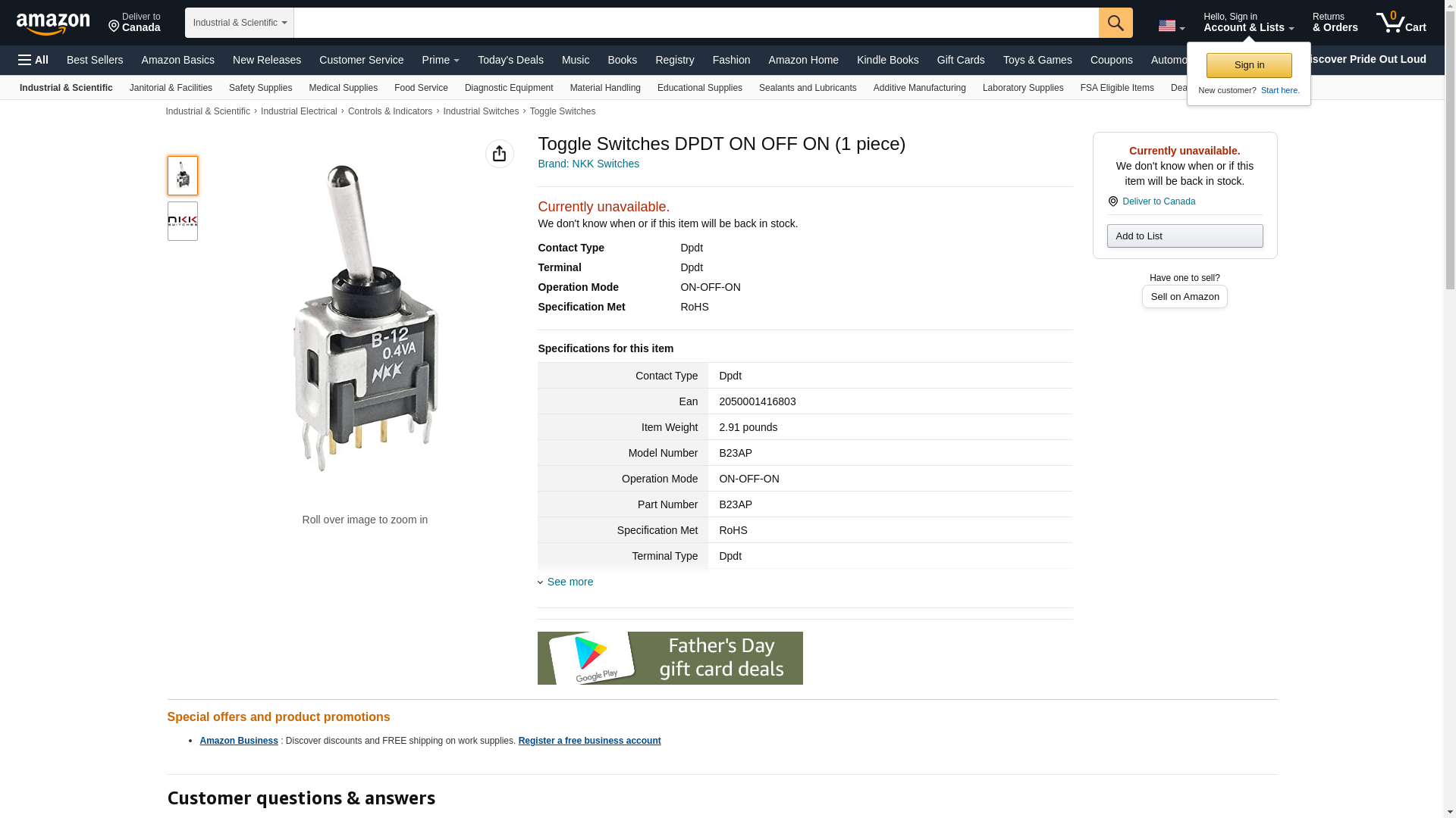 NKK Switches - B23AP - Switch,Sealed,Anti-Static Toggle,DPDT,ON-OFF-ON,Str PC,No Cap,0.4A,28VAC/DC - Allied Electronics & Automation, part of RS Group