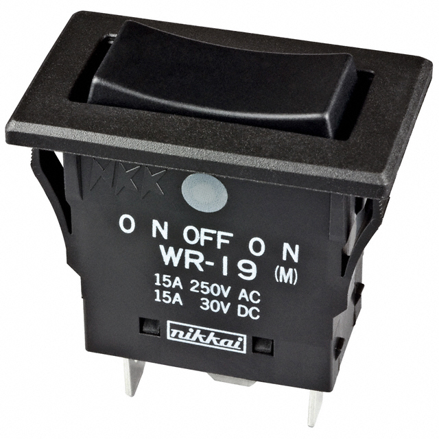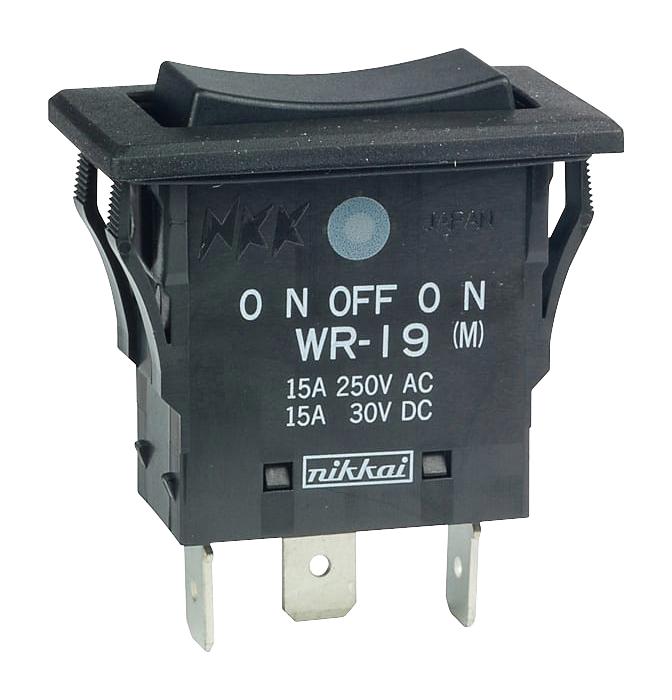NKK Switches - WR19AF - Rocker Switch,Sealed,SPDT,ON-OFF-(ON),Black Actuator,15A,125VAC,.250" QC - Allied Electronics & Automation, part of RS Group