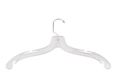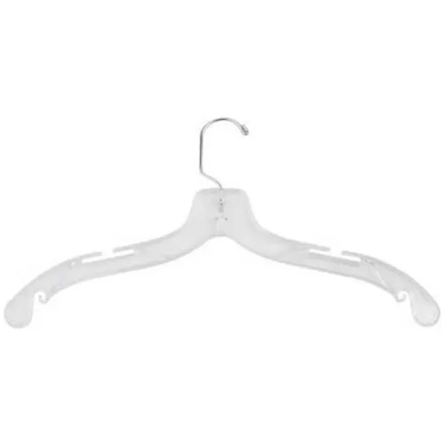 - 17" Clear plastic hanger good for hanging top pieces like shirts, blouses, sweatshirts, jackets, and other light to middle heavy weight garments