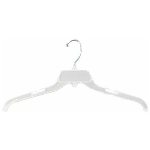- 17" VICS compliant clear plastic hanger good for hanging top pieces like shirts, blouses, sweatshirts, jackets, and other light to middle heavy weight garments