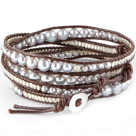 <ul> <li>Shabby chic pearl and leather wrap bracelet</li> <li>Layers of pearls, silver beads, and leather cording</li> <li>Great for wearing alone or with simple bangles</li> <li>Adjustable silver button-and-loop close</li> </ul>
