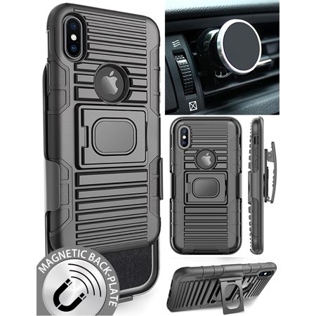 iPhone X Case/Mount/Clip, Nakedcellphone's Black Ring Grip Case Cover + Belt Clip Holster Stand + Magnetic Car Mount for Apple iPhone 10