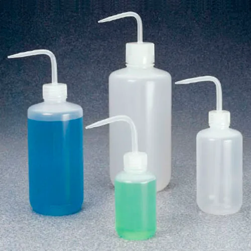 Low-density polyethylene bottle, polypropylene screw closure/stem, and polypropylene copolymer draw tube. Through-the-top wash bottle with closure and stem molded in one piece for leakproof service. Tip can be cut back to increase flow. Tight fit of draw tube and closure prevents separation. Leakproof.