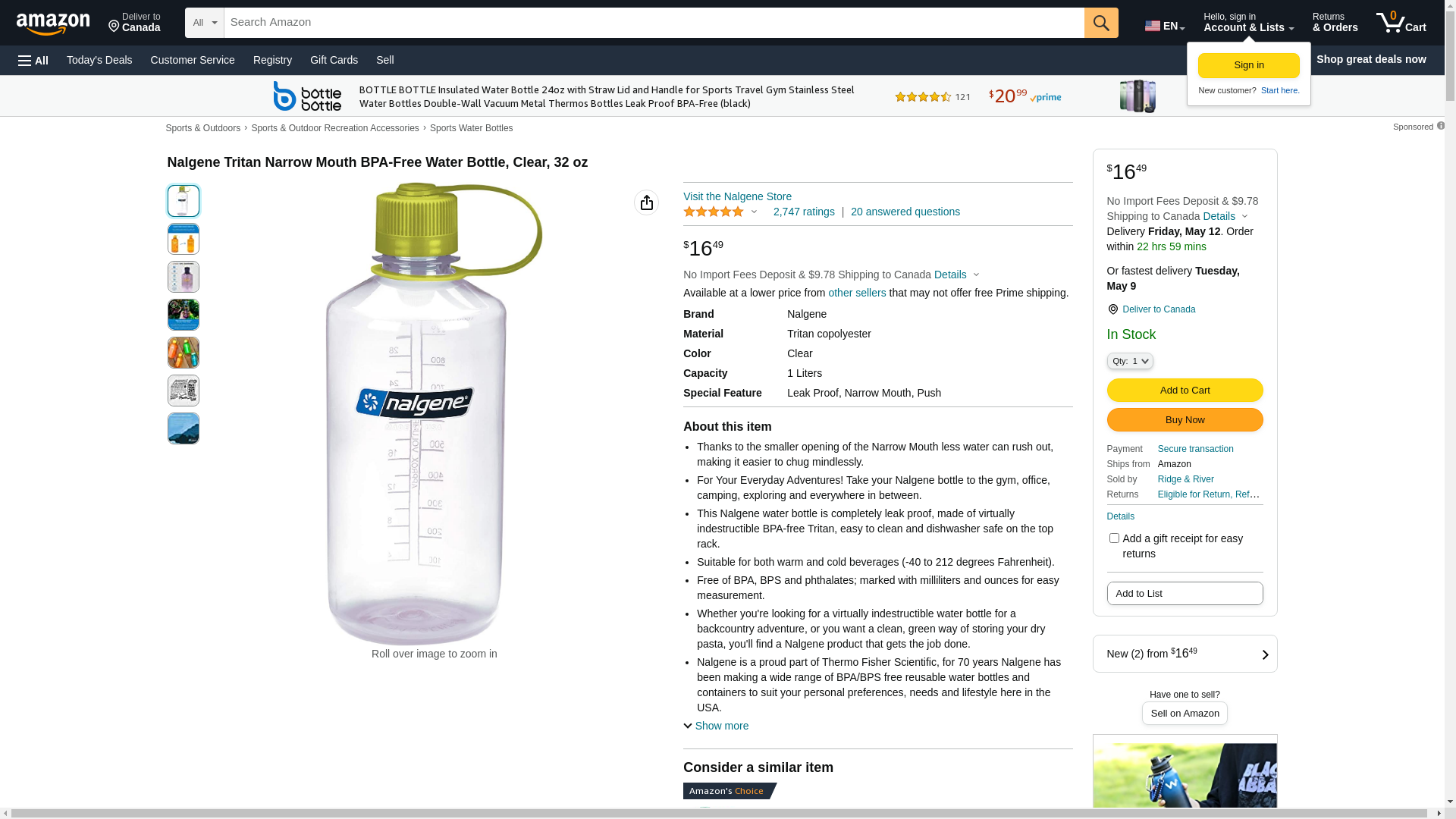 Nalgene Tritan 32-Ounce Narrow Mouth BPA-Free Water Bottle, Clear