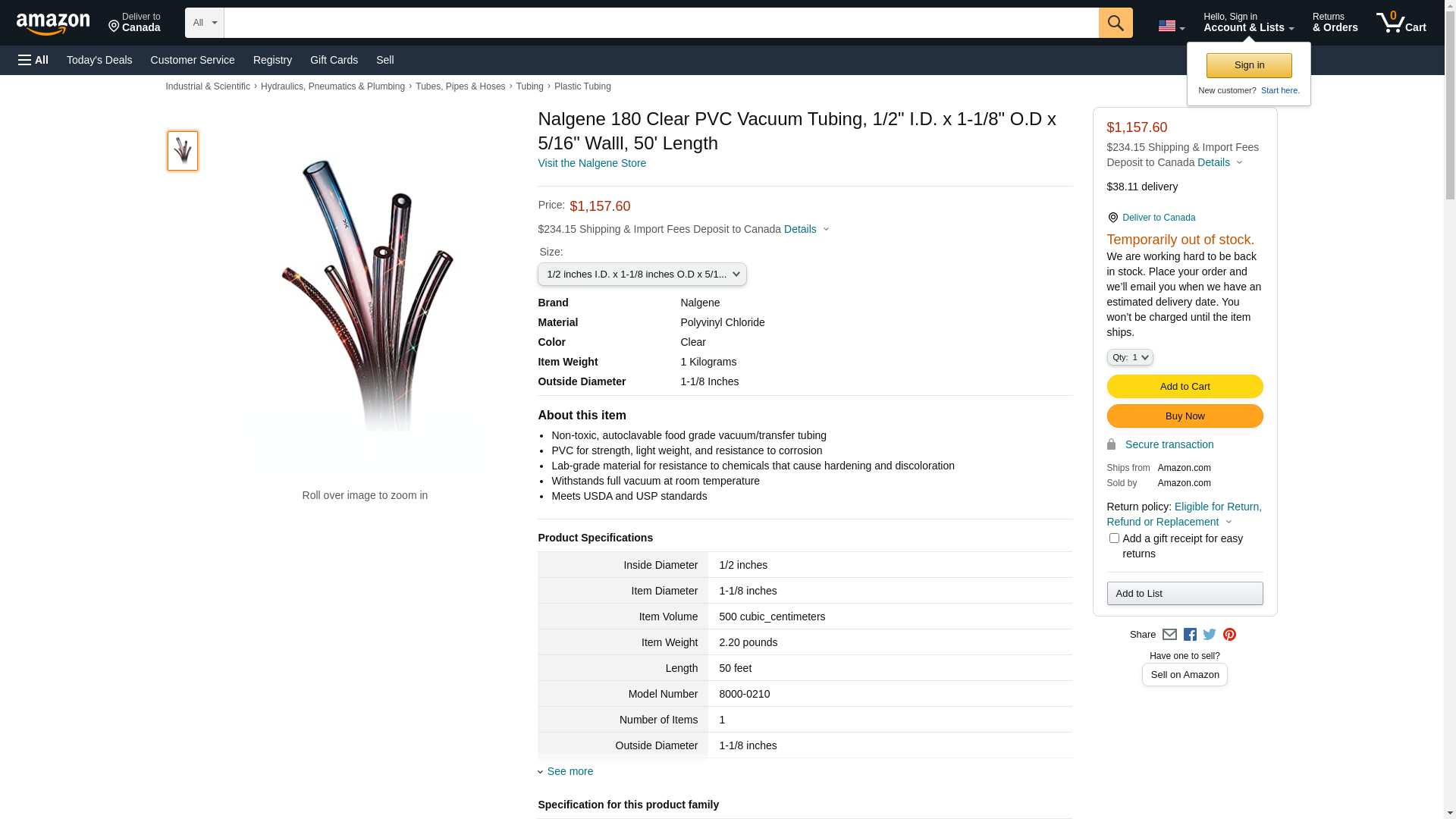 Nalgene 180 Clear PVC Vacuum Tubing, 3/8" I.D. x 7/8" O.D x 1/4" Walll, 10' Length