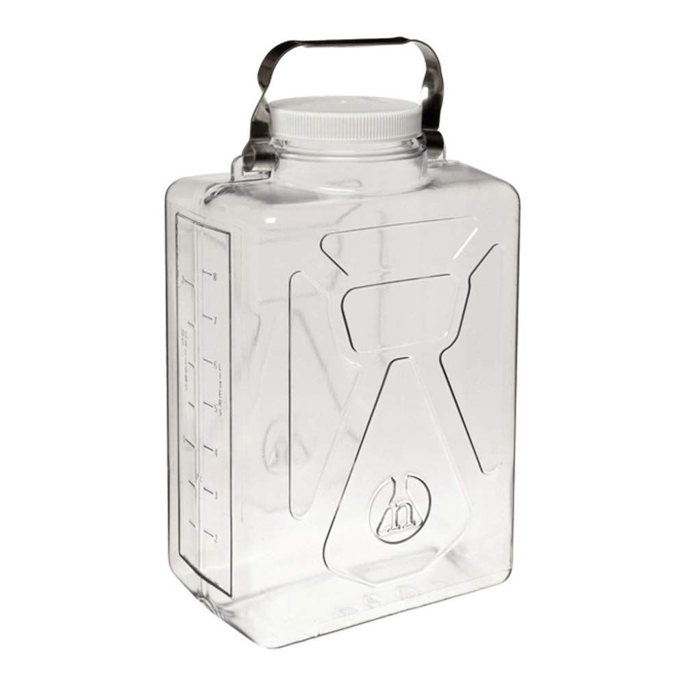 The 9 Liter rectangular polycarbonate carboy with a polypropylene screw closure is lightweight glass-clear and extremely impact resistant. Ideal for collecting and storing solids and for use at extreme temperatures. This carboy has a 3-1/2 inch neck opening and a sturdy handle and is graduated in liters and gallons. Transparent. Graduated. Material: polycarbonate with a polypropylene screw closure. Nominal capacity: 9L. Neck finish: 100. Dimensions: A: 86mm; B: 361mm; C: 351mm; D: 320 x 153mm. Sold individually. Nalgene #: DS2213-0020.