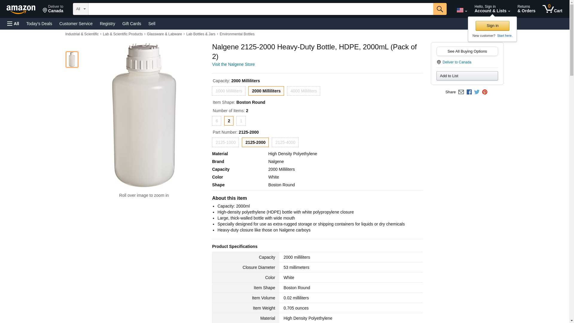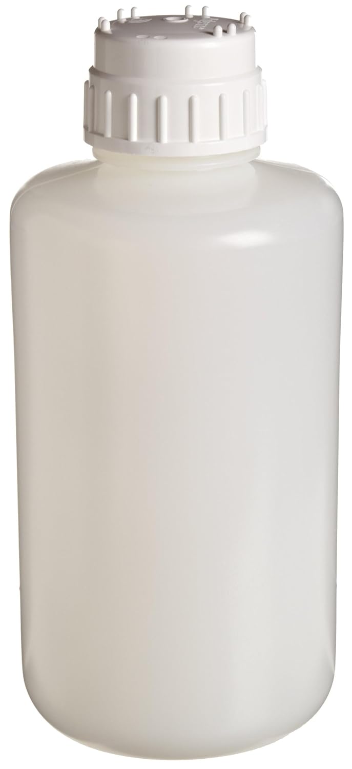 This 2000mL high-density polyethylene (HDPE) bottle has a unique heavy-duty construction. A large thick-walled bottle with a wide mouth it is specially designed for use as an extra-rugged storage or shipping container for liquids or dry chemicals. Heavy-duty closure like those on Nalgene carboys. HDPE Bottle with white polypropylene closure. Capacity: 2000mL. Nalgene #: 2125-2000.