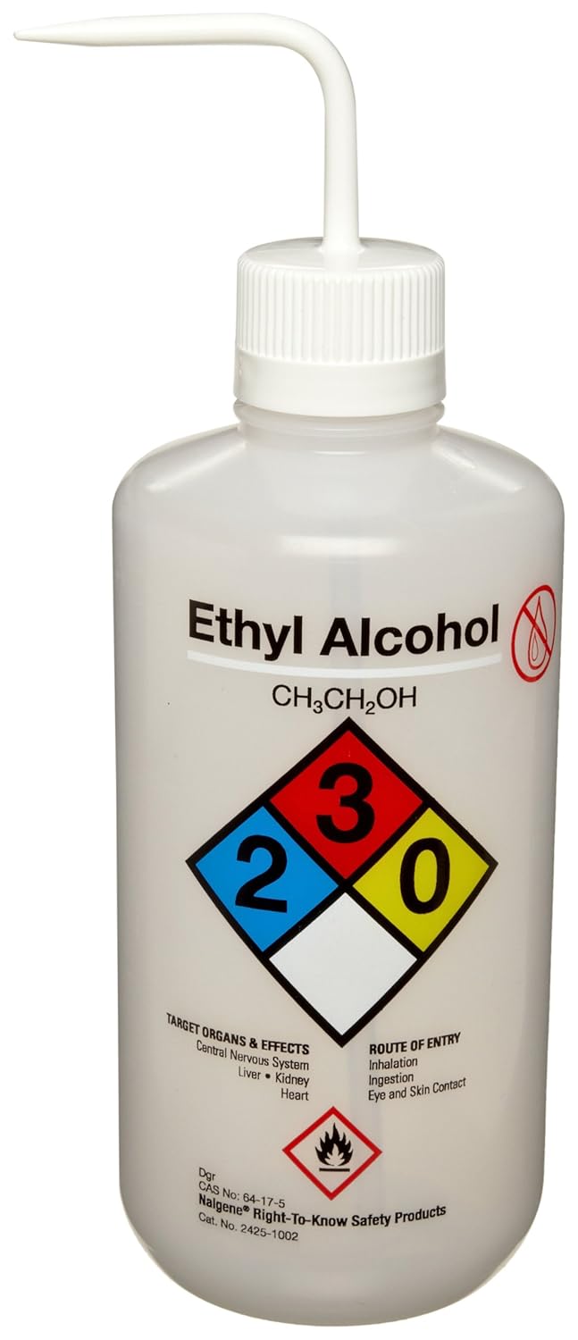 This 1000mL (32 ounce) Right-To-Know safety ethyl alcohol wash bottle is molded of low-density polyethylene with polypropylene closure for greater chemical resistance. The bottle is self-venting and the non-metallic vent keeps contents in bottle with no risk of solvent leakage. The bottle features the silk-screened 'ethyl alcohol' label the International Chemical Society (ICS) chemical formula and Chemical Abstract Service (CAS) number. To prevent cross-contamination each bottle has a color bar which corresponds to the same-colored closure. Chemical: ethyl alcohol. Material: LDPE with PP closure. Closure size: 38-430mm. Capacity: 1000mL. Nalgene #: 2425-1002.