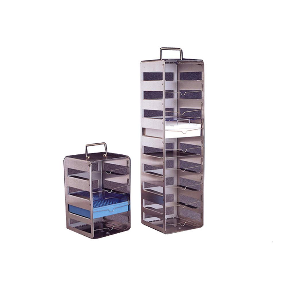 This stainless steel 4-shelf vertical CryoBox rack has innovative retainers to hold each CryoBox securely but separately. The rack allows for fast retrieval of one box and immediate return to rack. Stainless steel construction can withstand extreme temperatures. Rack continues to hold its shape after repeated use. Suitable for storage of 5 x 5 array CryoBoxes containing 1-2mL vials. Dimensions (W x D x H): 83 x 84 x 225mm (3-1/4 x 3-3/8 x 8-3/4 inches). Material: stainless steel. Number of shelves: 4. Sold individually. Nalgene #: DS5035-0004.