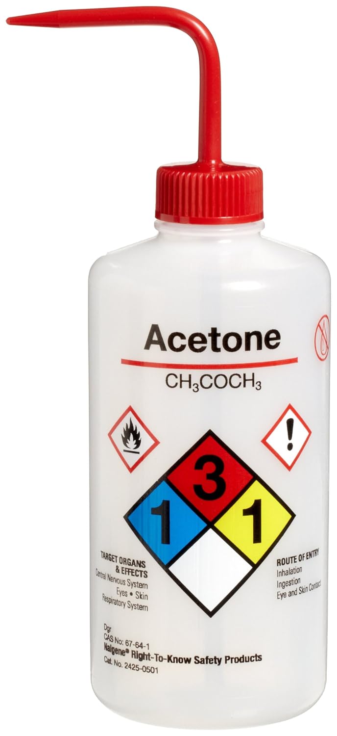 This 500mL (16 ounce) Right-To-Know safety acetone wash bottle is molded of low-density polyethylene with polypropylene closure for greater chemical resistance. The bottle is self-venting and the non-metallic vent keeps contents in bottle with no risk of solvent leakage. The bottle features the silk-screened 'acetone' label the International Chemical Society (ICS) chemical formula and Chemical Abstract Service (CAS) number. To prevent cross-contamination each bottle has a color bar which corresponds to the same-colored closure. Chemical: acetone. Material: LDPE with PP closure. Closure size: 28mm. Capacity: 500mL. Nalgene #: 2425-0501.