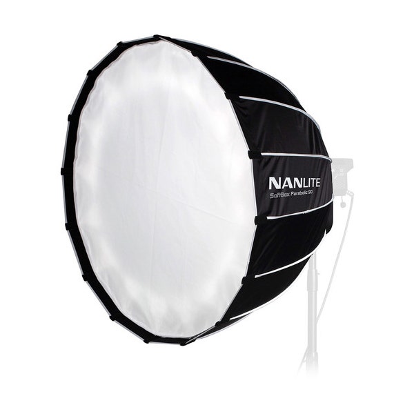 The Nanlite Para 90 Quick-Open Softbox with Bowens Mount (35in) is a 16-Sided Softbox with a deep parabolic design that creates even lighting with a wrap-around quality and natural-looking catchlights while increasing directional control. Control and Shape Light The Para 90's reflective silver interior maximizes light output while the removable front diffuser softens it and reduces contrast. Also, the parabolic shape creates even lighting with a wrap-around quality and natural-looking catchlights. Its 25" depth produces a focused light with increased directional control, minimal spill light, and significant falloff. Multiple Diffusion Options Nanlite provides both a 1-stop and a 2-stop front diffuser to enable even more adjustment of light quality. Also, using neither diffuser turns the Para 90 into a large reflector outputting high contrast light. Bowens Style Speed Ring Created to be compatible with Nanlite's Forza Series LEDs, the Para 90 includes a Bowens Style Speed Ring. This near-universal light modifier mount expands compatibility to an extensive range of LED, strobe, and constant light sources. Fast Set Up and Break Down Nanlite Forza LEDs are ready at a moment's notice, so their softbox should be too. This softbox utilizes a Quick-Open speed ring with spring-loaded rod locks. Quickly snap the rods into place to set up the softbox and then release them at the touch of a button for break down. Accepts Optional Fabric Grids For additional control of light spill and added directionality, an optional fabric grid can be mounted via touch-fasteners. The fabric grid narrows the beam angle to 60 degrees and concentrates the light's beam forward. Fabric Grid sold separately, SKU# EC-PR90