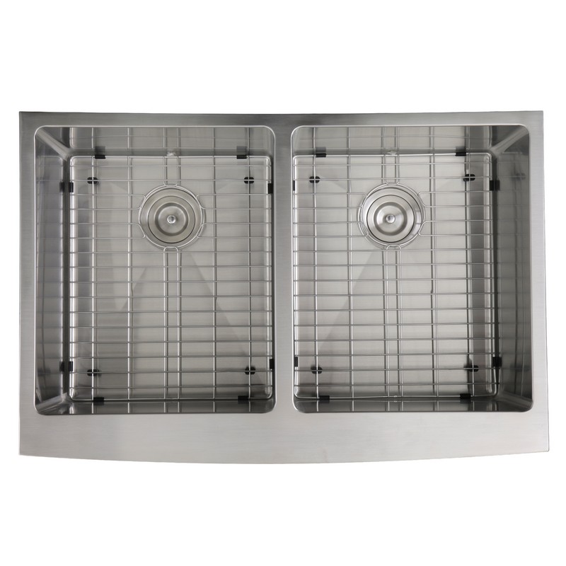This APRON332210-DBL-SR undermount Pro Series Apron provides double bowl functionality with small radius corners for additional space and a fresh modern industrial look in a farmhouse style sink. Two colander basket drains and 2 bottom grids are included with sink.The bottom of the sink has channel grooves to divert water for proper drainage. Nantucket Sinks stainless steel sinks have thick rubber dampening pads to dampen sound. Our finishing process helps keep our stainless steel corrosion-resistant to rust and oxidation. The satin finish makes daily maintenance a simple rinse! Features a limited lifetime warranty.,Following the trend for industrial style kitchens in the home, Nantucket answers the call with our Pro-Series sinks. All of these are high quality premium 16 gauge 30