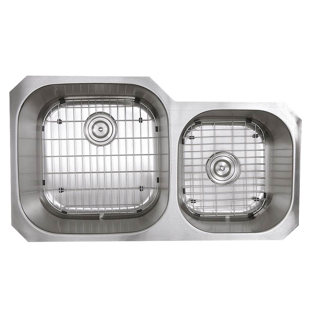 NS3520-16 Type: Large Left Bowl Features: -Kitchen sink.-Available in large left bowl or right bowl.-Most chefs will love this 16 Gauge contemporary Double Bowl with extra deep large bowl measuring 10 inches in depth.-Large double bowl features a very large basin to accommodate most pots and pans.-Smaller basin is perfect for washing vegetables.-Crafted from 304, 16 Gauge stainless steel.-Nantucket sinks are sprayed with a special insulation to reduce condensation.-Rubber padding is applied for noise reduction.-Grids available for almost all sink bowls some exceptions exist.-Left to right: 35 3/8''.-Front to back: 20 1/8''. Color/Finish: -Satin finish. Dimensions: -Big bowl dimensions: 18'' x 18''.-Small bowl dimensions: 14'' x 17''.-Big bowl depth: 10''.-Small bowl depth: 8''.