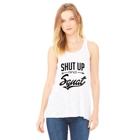 Our unique custom Shut Up and Squat Women's Flowy Racerback Tank is printed on exceptionally soft poly-viscose blend, in a flattering draped silhouette, round neck and racerback. Sideseamed. Relaxed, drapy fit. Merrowed bottom hem. Sheering at racerback seam. Material is 65% poly 35% viscose, 30 single 3.7 oz. (Ath. Heather - 52% poly 48% viscose). Shut Up and Squat women's flowy racerback tank is a perfect tank for wear everyday and look amazing in getting ready photos, while still being comfortable!!Decorated in the United States.