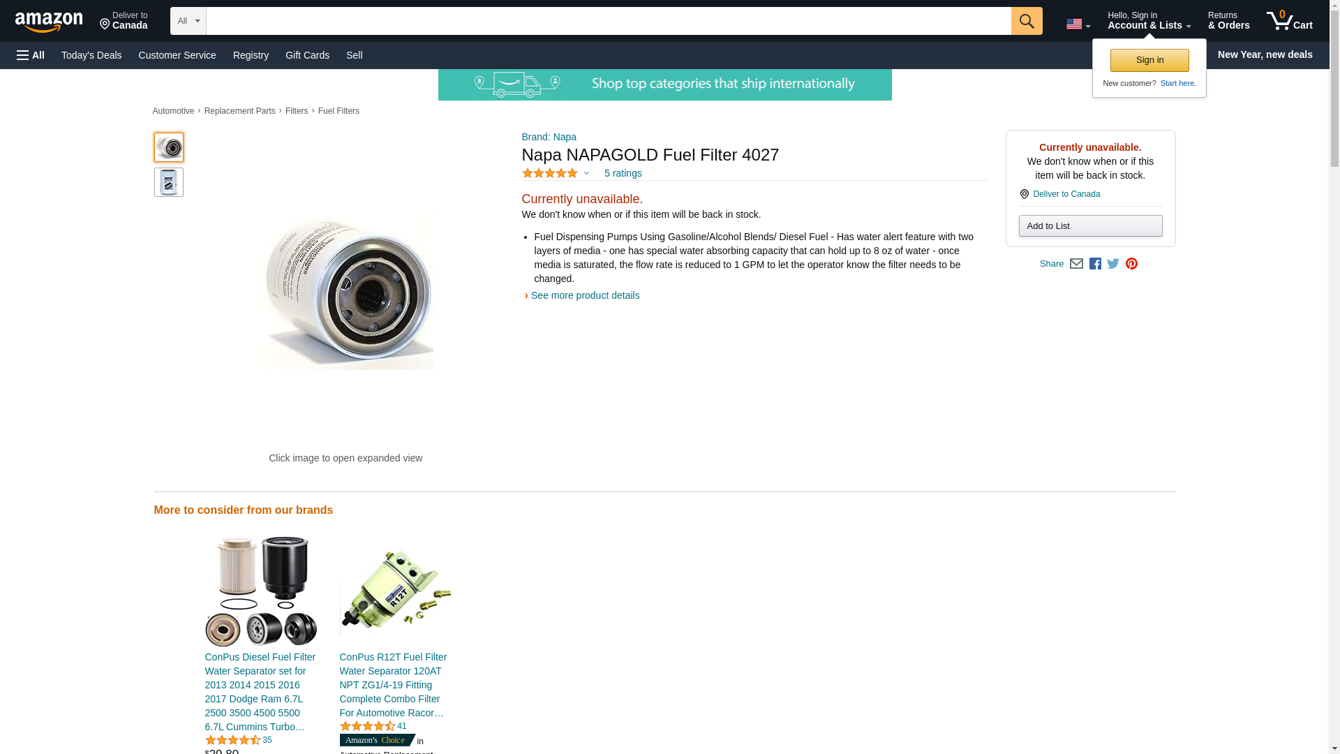 <p>This listing is for 1 New Part Number 4027 NAPA Gold Fuel Filter Features Benefits Fuel Dispensing Filter - 16 Micron - 15 GPM Flow Rate - This Filter Can Be Used With Gasoline, Ethanol Blends Or Diesel - Has Water Alert Design To Shut Down Flow When Water Is Present In Your Fuel Filter Style : Water Alert Spin-OnHeight (Inches) : 5.207"Gasket I.D. (Inches) : 2.415"Gasket I.D. (mm) : 61 mmGasket O.D. (Inches) : 2.729"Gasket O.D.(mm) : 69 mmGasket Thickness (Inches) : .255"Gasket Thickness (mm) : 7 mmHeight (mm) : 132 mmO.D. (Inches) : 3.694"O.D. (mm) : 94 mmThread Size (Inches) : 1-12Warranty NAPA Filters are Covered by a Comprehensive Limited Product Warranty. NAPA Filters May Pay the Reasonable Cost for Parts Labor to Repair any System Damaged by NAPA Filters Due to a Defect in Design or Material.</p><br /> <ul><li>Fuel Dispensing Pumps Using Gasoline/Alcohol Blends/ Diesel Fuel - Has water alert feature with two layers of media - one has special water absorbing capacity that can hold up to 8 oz of water - once media is saturated, the flow rate is reduced to 1 GPM to let the operator know the filter needs to be changed.</li></ul>