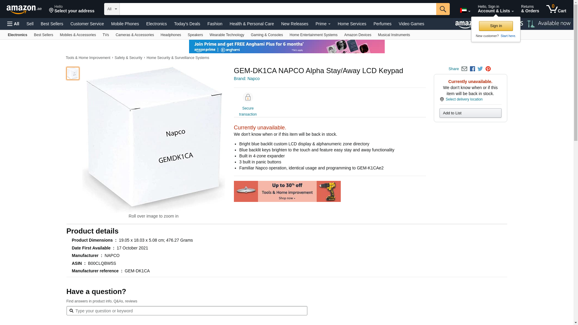 GEM-DK1CA NAPCO Alpha Stay/Away LCD Keypad