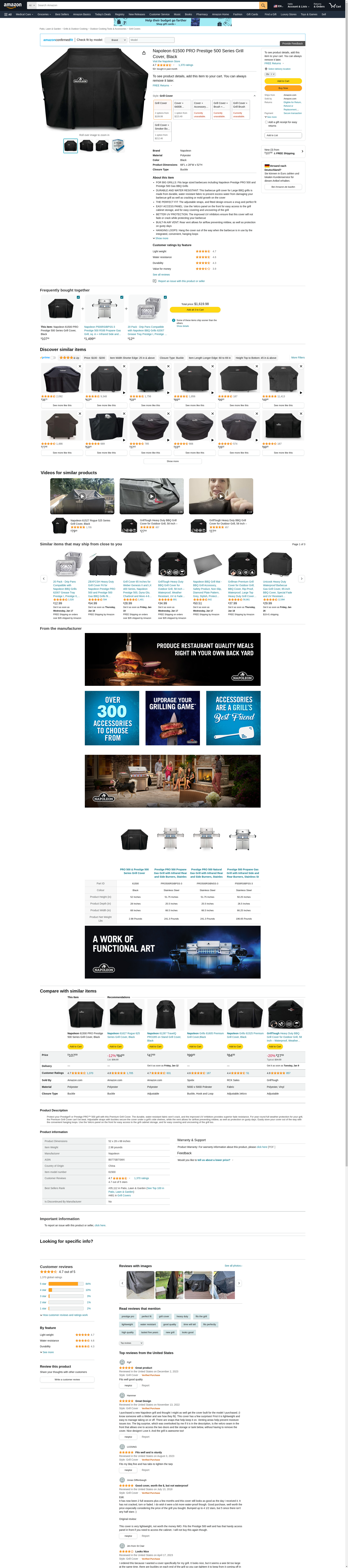 Napoleon 61500 PRO Prestige 500 Series Grill Cover, Black