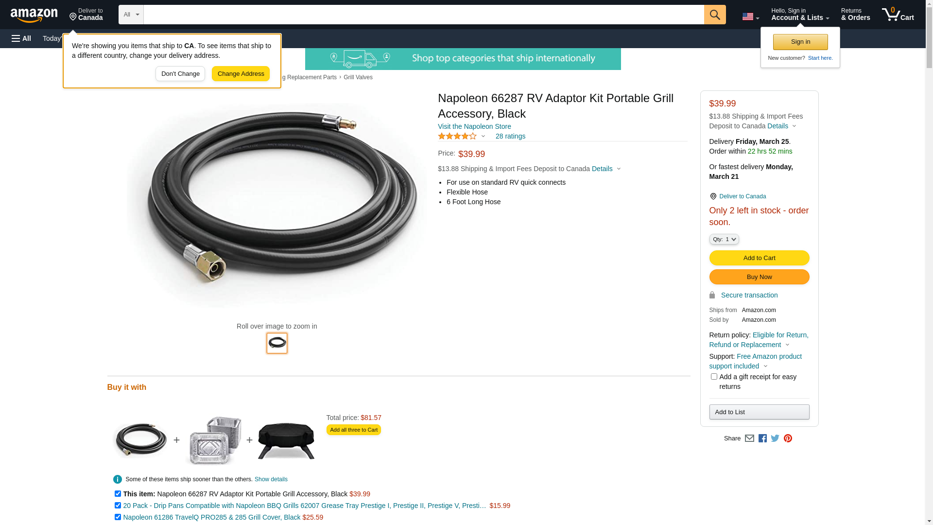 Napoleon 66287 RV Adaptor Kit Portable Grill Accessory, Black