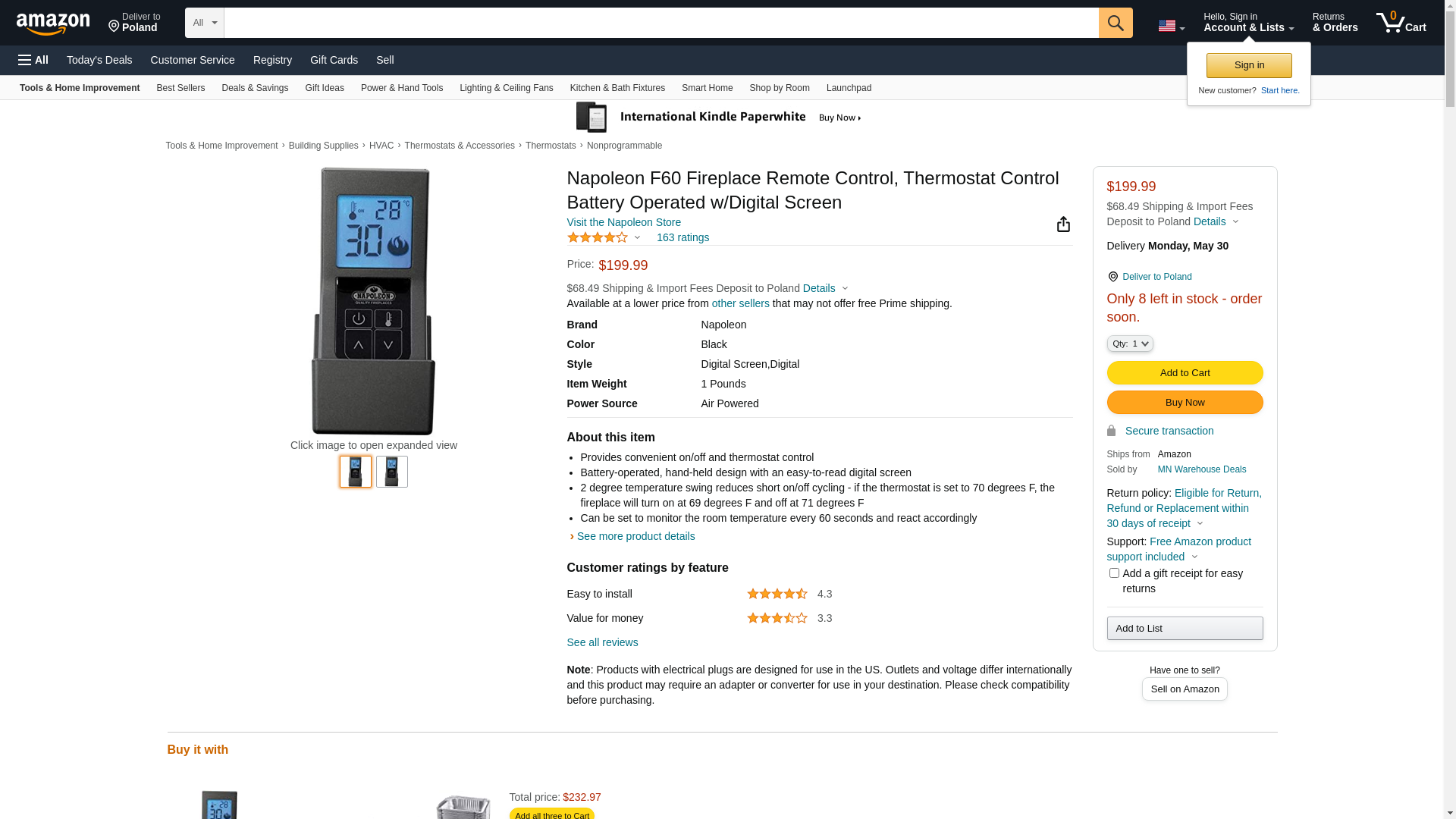 F60 with thermostate - Napoleon thermostatic hand held battery operated remote w/digital screen - Included Inside: Faceplate - Remote - Receiver - Batteries - Cradle - Manual.