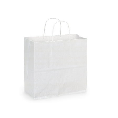 <ul> <li>These White Kraft paper shopping bags have serrated edge tops & sturdy paper twisted handles. Available by the carton or mini-pack as well as assortments.</li> <li>Dimensions and weights subject to modest variance. Joey size White Kraft Paper Shopping Bags by the mini-pack. 60# paper weight. Made in the USA.</li> </ul>
