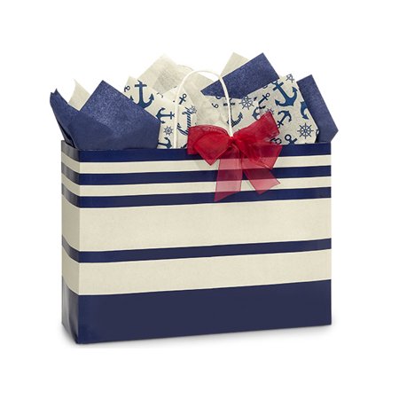 <ul> <li>100% Recycled Blue Indigo Stripe Paper Shopping Bags in popular indigo and cream color scheme. Coordinates with our Birch color tissue paper. Printed on 100% recycled fusion kraft paper and carry the Green Way? logo. Bags are 100% recyclable and contain minimum 40% PCW content.Made in the USA.</li> <li>Dimensions and weights subject to modest variance. Vogue Blue Indigo Stripe Paper Shopping Bags by the carton are made from recycled kraft fusion paper containing minimum 40% recycled material. Green Way? Eco-Friendly Packaging is made in the USA. Coordinates with our Birch color tissue paper. These bags are a navy and cream color (not white).</li> </ul>
