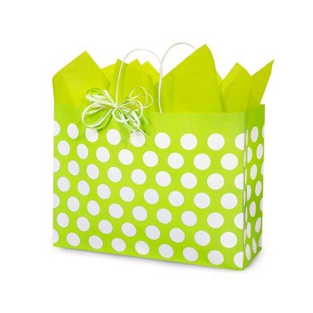 <ul> <li>Bright Citrus Green and white polka dot bags are made from 100% recycled white kraft paper. Bags are 100% recyclable and contain minimum 40% PCW content and carry the Green Way ? logo. These bags are legal for use in most states.Made in the USA.</li> <li>Dimensions and weights subject to modest variance. Vogue size Citrus Polka Dots Shopping Bags by the carton are made from 100% recycled white kraft paper. Green Way? Eco-Friendly Packaging. Bags are 100% recyclable and contain minimum 50% post consumer recycled content. Coordinates with our Ctirus Polka Dot Collection. Made in the USA.</li> </ul>