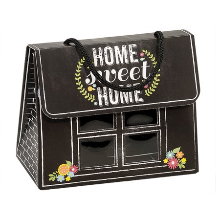 <ul> <li>Gourmet window gift boxes have rope cord handles and are printed in the interior of the box. The small boxes have 7" rope handles for easy carrying, and a 2 x 3-3/4" acetate window in the front. Velcro holds the die cut fold over flap closed. The large boxes have 8-1/2" rope handles, and a 2-3/4 x 5" acetate window in the front. These boxes make a perfect presentation for your gourmet products.</li> <li>Dimensions and weights subject to modest variance. Small Chalkboard Home Sweet Home Gourmet Window Totes have rope handles and clear acetate windows. They have an erased chalkboard look on the black background. Great for realtors! Coordinates with our Chalkboard Collection.</li> </ul>