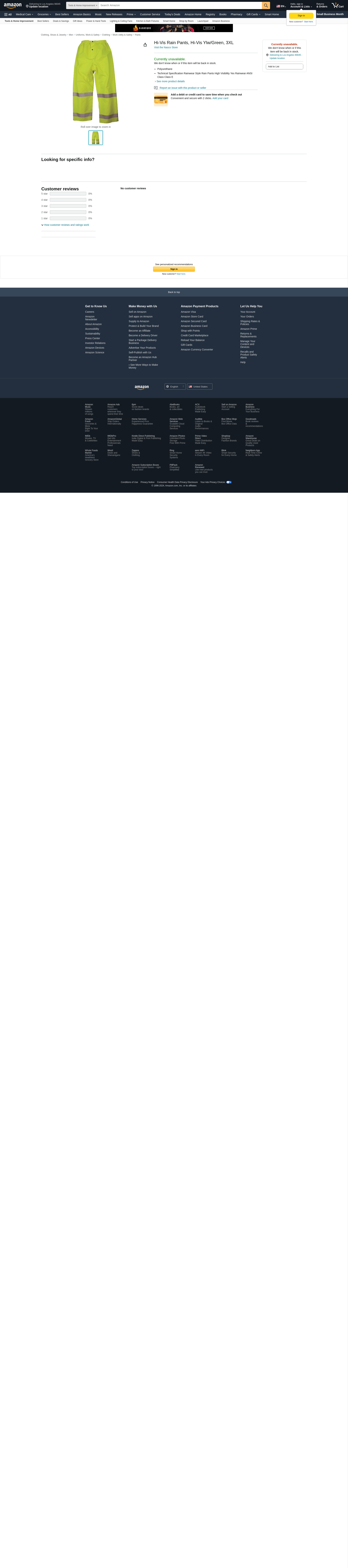 Technical Specification Rainwear Style Rain Pants High Visibility Yes Rainwear ANSI Class Class E Rainwear Size 3XL Rainwear Color Yellow/Green Rainwear Features Breathable Rainwear Primary Material Polyester, Polyurethane Fits Waist Size 48 to 50 Rainwear Ankle Style Straight Cuff Rainwear Closure Type Elastic Gender Men's Inseam 32 Liner Material Polyester Material Polyurethane Seam Style Stitched, Taped Number of Pockets (Inside) 0 Number of Pockets (Outside) 0 Includes Fly front Thickness 0.2mm Fabric Weight 3.75 oz. Compliance and Restrictions This item is restricted for international sale. This listing is for each.
