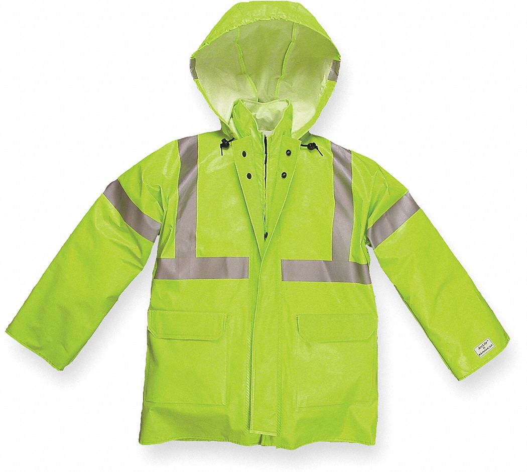 | Feature | <b>Price For:</b> Each <b>Seam Style</b>: Sealed <b>Gender</b>: Men\'s <b>Material</b>: Flame Resistant PVC/Nomex(R)/Kevlar(R) <b>Length</b>: 30" <b>Hazard Risk Category (HRC)</b>: 1 <b>Includes</b>: Reflective Striping, Mesh Ventilation, Hook-and-Loop Waist, Stow-Away Hood <b>Item</b>: Arc Flash Rain Jacket with Hood <b>Size</b>: 2XL <b>Color</b>: Hi-Visibility Lime Yellow <b>Fits Chest Size</b>: 52" to 54" <b>Standards</b>: ASTM 6413-99, ASTM F189 |