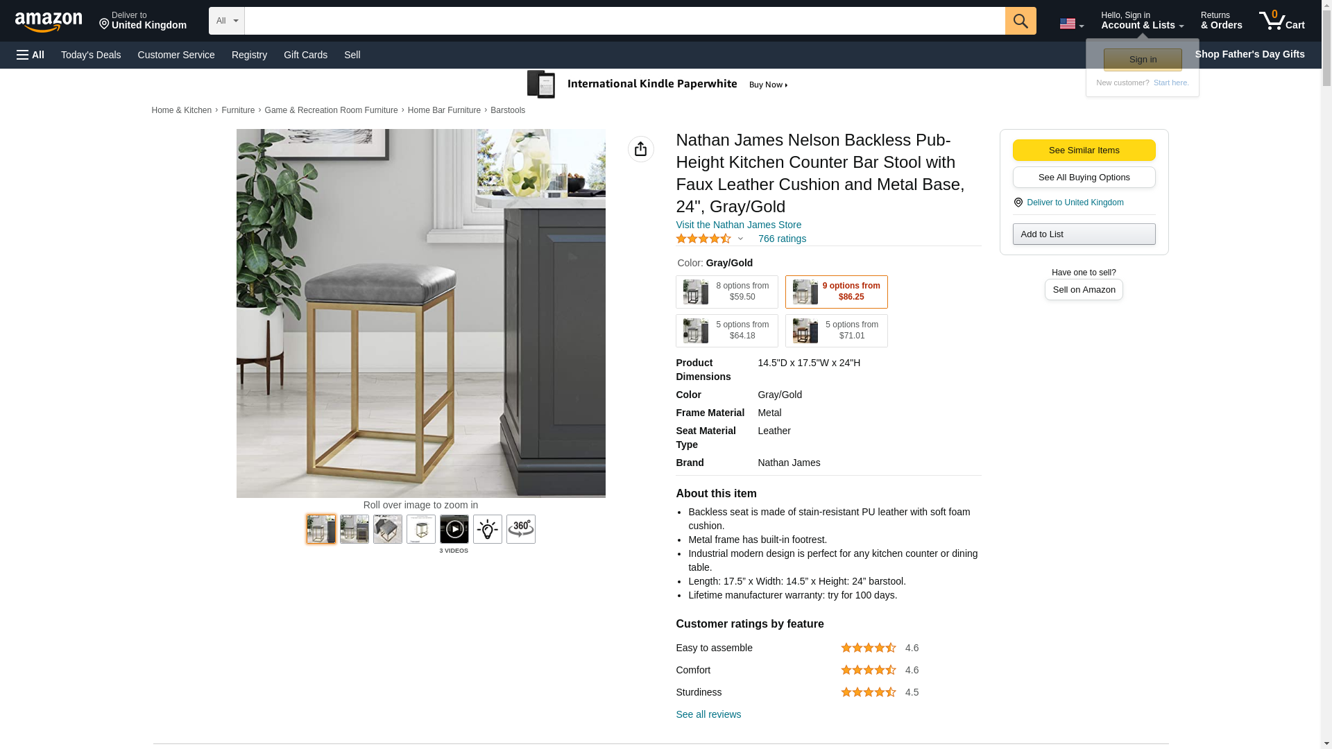 Nathan James Nelson Backless Pub-Height Kitchen Counter Bar Stool with Faux Leather Cushion and Metal Base, 24", Gray/Gold