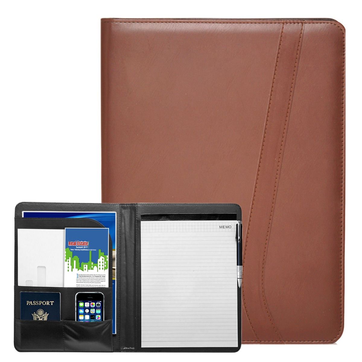 - The zip around Genuine leather padfolio, gusseted file pocket, half-pocket, business card and ID pocket in bonded leather