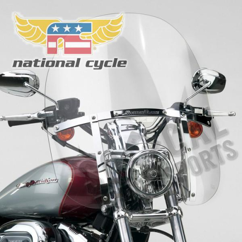 National Cycle SwitchBlade 2-UPWindscreen: SwitchBladeMaterial: Lexan PolycarbonateMaterial Finish: Quantum HardcoatedColor: ClearThickness: 4.0mmSecondary Material: SteelSecondary Material Finish: ChromedRequired Mount Type: SwitchBlade Quick Release Mount Kit RequiredDimensions: <br> Headlight Cutout to Top of Screen: 18.50" (45.0cm)<br> Overall Height: 26.50" (67.3cm)<br> Width Across Back at Widest Point: 23.00" (58.4cm)</br>* Actual Contents May Vary From Photo</br>* Requires Mount Kit</br>The largest of the four SwitchBlade Windshields, the 2-Up offers maximum protection from the wind and weather for you and your riding partner.<br>The 2-Up enhances your long rides by cutting fatigue and protecting you against debris. Coupled with a pair of Chrome Lower Deflectors and a National Cycle Light Bar, this windshield can transform your motorcycle into a serious touring bike at a fraction of the price of the upscale machines.<br>All SwitchBlade Windshields feature high quality chromed steel and stainless steel hardware. Best of all, their sturdy 4.0mm thick polycarbonate has National Cycle?s exclusive Quantum hardcoating for the ultimate in scratch resistance.<br>To top it off, they are backed by National Cycle's exclusive 3-Year Warranty against breakage.