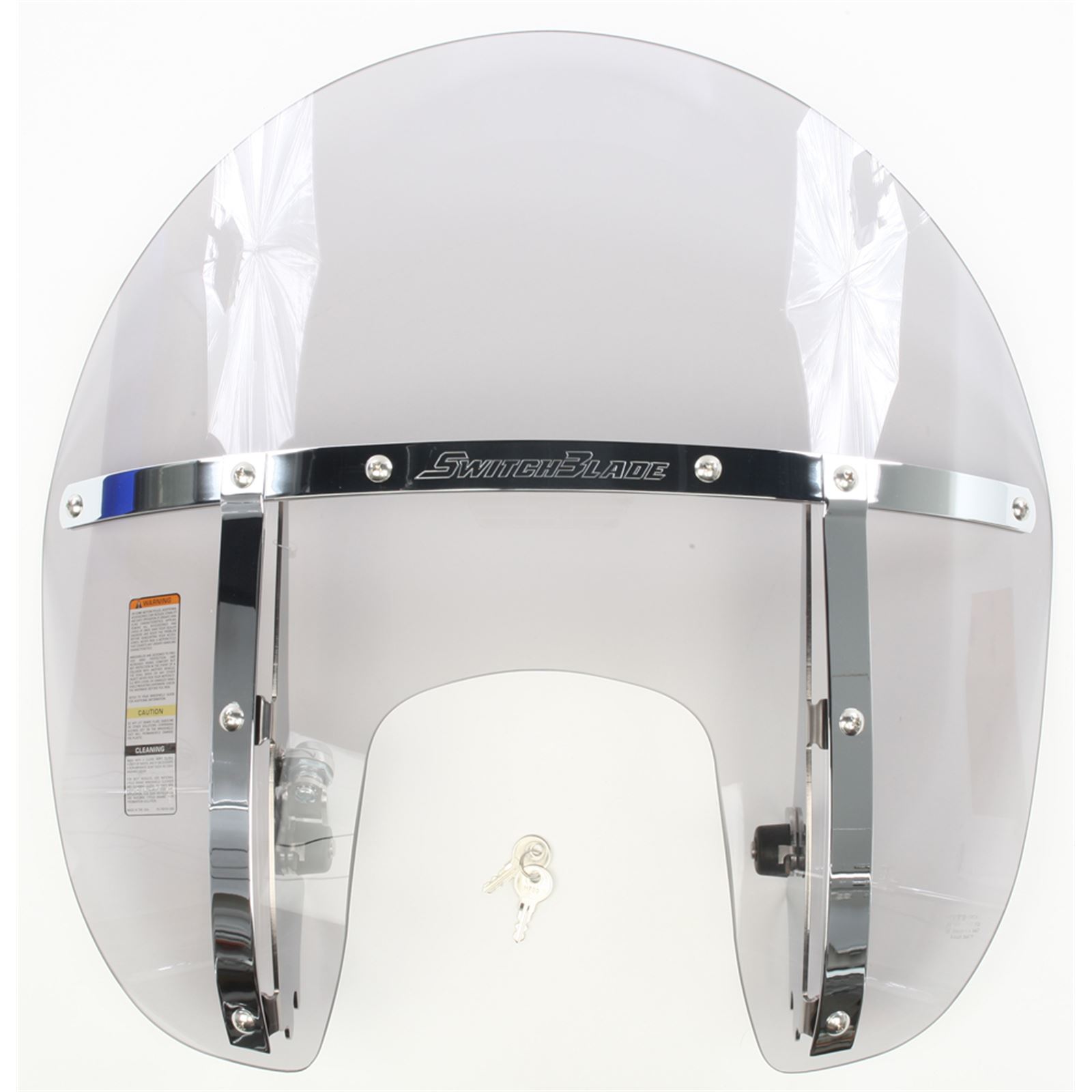 National Cycle SwitchBlade ChoppedWindscreen: SwitchBladeMaterial: Lexan PolycarbonateMaterial Finish: Quantum HardcoatedColor: ClearThickness: 4.0mmSecondary Material: SteelSecondary Material Finish: ChromedRequired Mount Type: SwitchBlade Quick Release Mount Kit RequiredDimensions: <br> Headlight Cutout to Top of Screen: 14.90" (37.9cm)<br> Overall Height: 21.10" (53.6cm)<br> Width Across Back at Widest Point: 22.20" (56.3cm)</br>* Actual Contents May Vary From Photo</br>* Requires Mount Kit</br>Is the 2-Up too tall, or the Shorty too short? The new SwitchBlade Chopped Windshield offers ample wind protection while still providing a clear view over the top of the windshield. Sleek and stylish with a classic look, the Chopped is an ideal choice for an all-season windshield.<br>All SwitchBlade Windshields feature high quality chromed steel and stainless steel hardware. Best of all, their sturdy 4.0mm thick polycarbonate has National Cycle?s exclusive Quantum hardcoating for the ultimate in scratch resistance.<br>To top it off, they are backed by National Cycle's exclusive 3-Year Warranty against breakage.