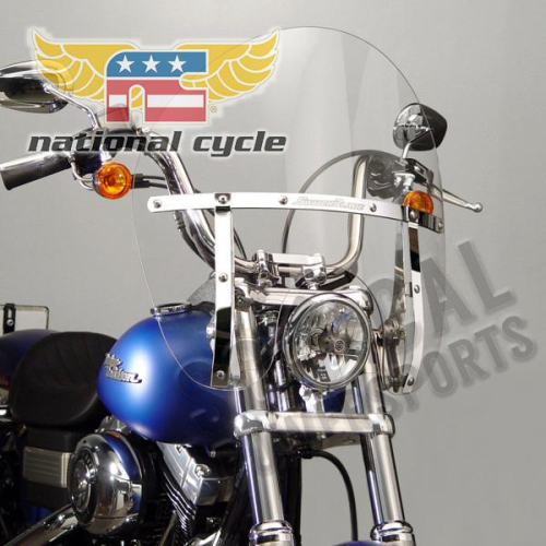 Like the 2-Up, but with a chopped top and a slimmer waist. Re-contoured top is 4 - 5" shorter (depending on model). Great wind protection while allowing a clear view over the top. Excellent choice for shorter riders or cruisers with lowered rear suspensio SwitchBlade® Windshields utilize National Cycle's SwitchBlade Mounting System, which lets riders install, switch, or remove their windshield in less than 5 seconds - with no tools! Switch styles...Switch attitudes...with SwitchBlade! Is the 2-Up too The re-contoured top is 4 - 5" shorter (depending on model) and the trimmed bottom profile is narrower. Get all the protection you need and the look you want! Quantum™ hardcoated Lexan® polycarbonate. DOT and ABE approved. The SwitchBlade Chopped is a cut-down version of the popular SwitchBlade 2-Up.