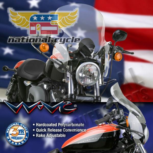 WAVE QR WINDSHIELD, H-D XL Innovative quick-release fairings.more than just a windshield!. The stylish Wave QR Fairing will give your motorcycle one big attitude. It fits the front end like a glove and features chrome quick release brackets with rake adjustability. The fairing is completely assembled and ready to mount to National Cycle's Quick Release Mount Kit. Polycarbonate with FMR hardcoat; XL model in light tint (screen size requires light tint for DOT approval), all other models in dark tint. Chrome quick release hardware with rake adjustability. The highly regarded Quick Release Mount Kit is the same as used for SwitchBlade and Spartan Windshields. Mount Kit sold separately. Made in USA.