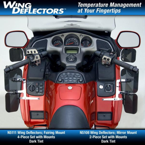 Fairing Mount Wing Deflectors, Light Tint (4-Piece Set) Compatible with Honda GL1800 Goldwing (2012 and newer). National Cycles new Quantum hardcoated polycarbonate Wing Deflectors have outstanding impact strength and scratch resistance! We made them tough - because No One Likes a Broken Wing! - Strong, one-piece, chromed steel supports - Stainless steel fasteners - Drilling template provided Exclusive swivel ratchets give the rider easy, independent adjustment of each wing by simply grasping them and rotating to the desired angle. National Cycle Wing Deflectors are warranted not to break in a tip-over. These will be the last set of wings youll ever need to buy! National Cycle Wing Deflectors coupled with a VStream Windscreen are the complete wind management solution! Dimensions Upper Wing: 5.6 in. x 7.3 in. (14.2cm x 18.5cm) Lower Wing: 5.6 in. x 5.8 in. (14.2cm x 14.7cm)