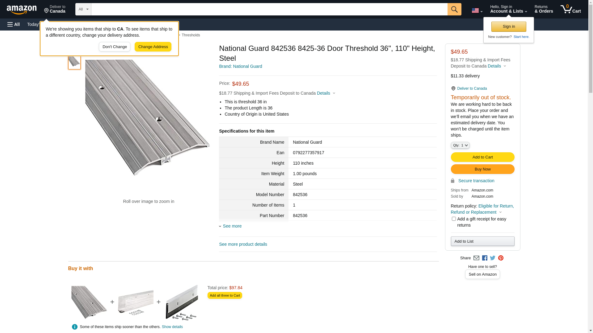 National Guard 842536 8425-36 Door Threshold 36", 110" Height, Steel