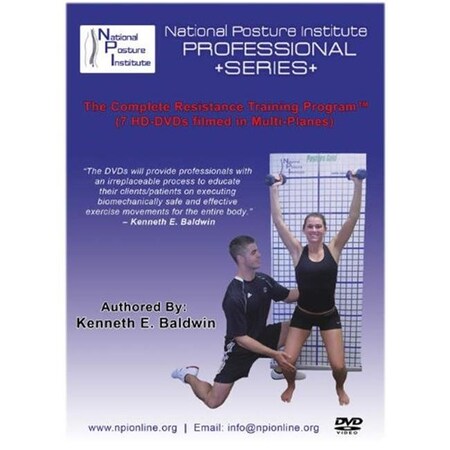 The National Posture Institutes Professional Series- The Complete Resistance Training Program is designed for personal trainers group exercise instructors athletic trainers allied medical professionals physical therapistschiropractors interested in learning a detailed process to teach analyze and perfect resistance training exercisesmovements for their clientspatients. Whether you are a fitnesshealth professional college student or individual from the general public learn how to perform biomechanically safe and effective resistance exercises and develop training programs to correct posture and body alignment and avoid exercise- related injuries. Learning Instructions. Learn to chose and teach the safest exercise movement for specific muscle groups based on physiological neurological and biomechanical principles. Learn the proper method to teach demonstrate and graderank an exercise movement using NPIs Exercise- Movement Grading System. Learn how to develop observation evaluation educational and feedback strategies. Learn the 3 phases of biomechanicalscientific analysis to perform resistance training exercises using free weights cableselectorized machines body weight exercises stability balls exercise tubing etc. Learn how to sequence and select the best exercises to enhance a clientspatients posture and body alignment using NPIs Exercise Training Matrix. Features. 7- DVDs 11 Hoursfilmed in HD includes exercise design for chestbackshouldersarmslegstrunkcore. 300 videos filmed in multi- planes lateralanterior or posterior providing unparalleled details on exercise performance. Exclusive lectures instruction and guidance by Ken Baldwin Assistant Professor State University of New York NPIs Executive Director IDEA Personal Trainer of the Year Award Recipient. Professional instruction to improve posturebody alignment and exercise performance to prevent injury. Complete Exercise Modalities including free weights cableselectorized machines body weight training stability ba