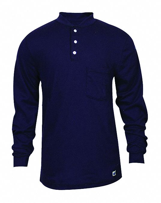 National Safety Apparel - C54PIBSLSMD - Navy Flame-Resistant Henley Shirt, Size: M, Fits Chest Size: 38 to 40, 12.0 cal./cm2 ATPV Rating