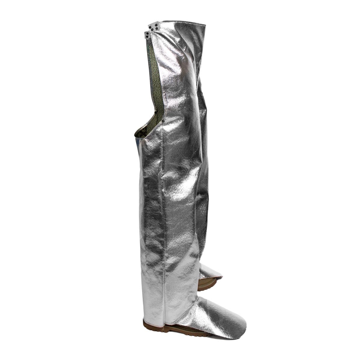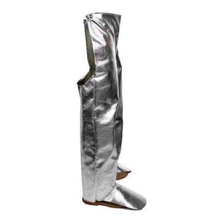 Adjustable Locations Waist, Aluminized Material OPF/Para-Aramid, Ankle Closure Buckle, Color Silver, EN ISO 11612 Performance Convective Heat (B) Level 1, Flame (A), Molten Aluminium Splash (D) Level 3, Molten Iron Splash (E) Level 3, Radiant Heat (C) Level 4, Fabric Weight 19 oz, Features Aluminized Foot Flap, and Molten Metal Splash Hazards, Leather Crotch Reinforcement, Leather Strap at Waist with Belt Buckle for Adjustment, Provides Protection from Radiant Heat, Sparks, Includes Lining Yes