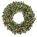 - Designed with a Crestwood Spruce branch base, this pre-lit artificial Christmas wreath is 30 inches wide and decorated with berry clusters, pine cones and frosted branches.