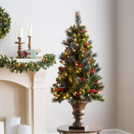 National Tree Company Pre-Lit Artificial Mini Christmas Tree, Green, Crestwood Spruce, White Lights, Decorated with Pine Cones, Berry Clusters, Frosted Branches, Includes Pot Base, 4 Feet