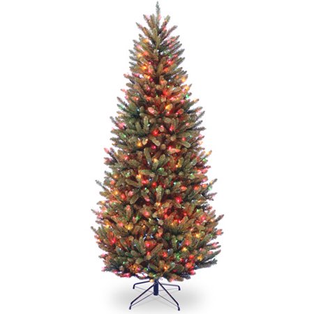 <br /> <b>National Tree Pre-Lit 7-1/2' Natural Fraser Slim Fir Hinged Artificial Christmas Tree with 600 Multi Lights:</b> <ul> <li>Measures 7.5' tall with 48" diameter</li> <li>Pre-strung with 600 UL listed multicolor lights</li> <li>1667 branch tips</li> <li>All-metal, hinged construction (branches are attached to center pole sections)</li> <li>Comes in 3 sections for quick and easy set-up</li> <li>Includes sturdy folding metal tree stand</li> <li>Light string features Bulb-Lock to keep bulbs from falling out</li> <li>If 1 bulb burns out, others remain lit</li> <li>Fire-resistant and non-allergenic</li> <li>Includes spare bulbs and fuses</li> <li>5-year tree warranty/2-year lights warranty</li> <li>Packed in reusable storage carton</li> <li>Assembly instructions included</li> </ul>