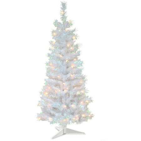 <br /> <b>4' White Iridescent Tinsel Tree with Clear Lights:</b> <ul> <li>Measures 4' tall with 24" diameter</li> <li>Pre-strung with 70 UL listed clear lights</li> <li>110 branch tips</li> <li>Matching color 3-leg tree stand</li> <li>Light string features Base Lock to keep bulbs from falling out</li> <li>If 1 bulb burns out, others remain lit</li> <li>Fire-resistant and non-allergenic</li> <li>Includes spare bulbs and fuses</li> <li>Packed in reusable storage carton</li> </ul>
