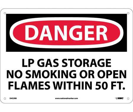 As an Amazon Associate, we earn from qualifying purchases. Danger LP Gas Storage No Smoking Or Open Flames Within 50 Ft. Sign NATIONAL-MARKER-COMPANY . D452RB Gallery Attributes Brand name, Manufacturer name, ManufacturerNATIONAL-MARKER-COMPANY Attribute00No Smoking Sign Attribute01Rigid Plastic Attribute02, colorRed / Black on White Attribute03Message Only Attribute04DANGER - LP GAS STORAGE NO SMOKING OR OPEN FLAMES WITHIN 50 FT Attribute05English Attribute0610 in Attribute0714 in Attribute080.05 in Attribute09+183 ?F Attribute10Mounting Holes Attribute11Indoor Attribute12Rectangle Attribute13OSHA 29 CFR 1910.145 Attribute141 per Each AttributeKey00Type AttributeKey01Material AttributeKey02Color AttributeKey03Message or Graphic AttributeKey04Message AttributeKey05Language AttributeKey06, height_AttribHeight AttributeKey07, width_AttribWidth AttributeKey08Thickness AttributeKey09Application Temperature Rating AttributeKey10Mounting Type AttributeKey11Special Features AttributeKey12Shape AttributeKey13Compliance/Standards AttributeKey14Package Quantity DimensionUnitinch KnownMan, Extra Product NameDanger LP Gas Storage No Smoking Or Open Flames Within 50 Ft. Sign height10.0 moq, multiple, tierMinQty11 MPND452RB qtyInStockAvailable SKU43594 tierPrice116.56 width14.0 Distributor offers SellerSKUMOQIn stockMultiplePrices hantover.com435941Available11 @ $16.56