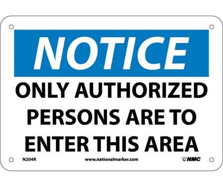 As an Amazon Associate, we earn from qualifying purchases. NMC N204R Notice Only Authorized Persons Are To Enter Plastic Sign NATIONAL-MARKER-COMPANY . N204R Gallery Attributes Brand name, Manufacturer name, ManufacturerNATIONAL-MARKER-COMPANY Attribute00Entrance Sign Attribute01Rigid Plastic Attribute02, colorBlack / Blue on White Attribute03Message Only Attribute04NOTICE - ONLY AUTHORIZED PERSONS ARE TO ENTER THIS AREA Attribute05English Attribute067 in Attribute0710 in Attribute080.05 in Attribute09+183 ?F Attribute10Mounting Holes Attribute11Indoor Attribute12Rectangle Attribute13OSHA 29 CFR-1910.145 Attribute141 per Each AttributeKey00Type AttributeKey01Material AttributeKey02Color AttributeKey03Message or Graphic AttributeKey04Message AttributeKey05Language AttributeKey06, height_AttribHeight AttributeKey07, width_AttribWidth AttributeKey08Thickness AttributeKey09Application Temperature Rating AttributeKey10Mounting Type AttributeKey11Special Features AttributeKey12Shape AttributeKey13Compliance/Standards AttributeKey14Package Quantity DimensionUnitinch KnownMan, Extra Product NameNMC N204R Notice Only Authorized Persons Are To Enter Plastic Sign height7.0 moq, multiple, tierMinQty11 MPNN204R qtyInStockShips SKU20276RP710 tierPrice120.59 width10.0 Distributor offers SellerSKUMOQIn stockMultiplePrices hantover.com20276RP7101Ships11 @ $20.59