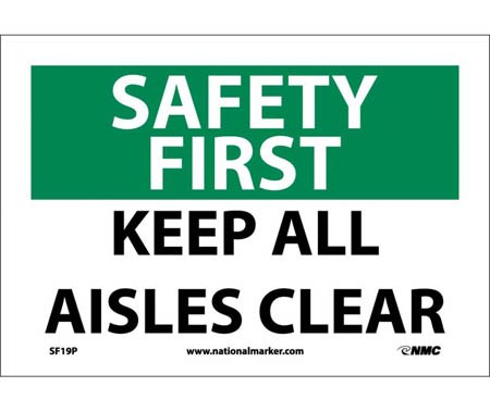 As an Amazon Associate, we earn from qualifying purchases. Safety First Keep All Aisles Clear Sign, Vinyl National-Marker-Company . SF19P Gallery Attributes Brand name, Manufacturer name, ManufacturerNational-Marker-Company Attribute00Safety Awareness Sign Attribute01Vinyl Attribute02, colorGreen / Black on White Attribute03Message Only Attribute04SAFETY FIRST - KEEP ALL AISLES CLEAR Attribute05English Attribute067 in Attribute0710 in Attribute080.004 in Attribute09+178 ?F Attribute10Adhesive Backed Attribute11Indoor Attribute12Rectangle Attribute13OSHA 29 CFR-1910.145 Attribute141 per Each AttributeKey00Type AttributeKey01Material AttributeKey02Color AttributeKey03Message or Graphic AttributeKey04Message AttributeKey05Language AttributeKey06, height_AttribHeight AttributeKey07, width_AttribWidth AttributeKey08Thickness AttributeKey09Application Temperature Rating AttributeKey10Mounting Type AttributeKey11Special Features AttributeKey12Shape AttributeKey13Compliance/Standards AttributeKey14Package Quantity DimensionUnitinch KnownMan, Extra Product NameSafety First Keep All Aisles Clear Sign, Vinyl height7.0 moq, multiple, tierMinQty11 MPNSF19P qtyInStockShips SKU20286PS710 snippetYour trusted distributor since 1939. Offering thousands of products from top brands for all your manufacturing and facility needs. tierPrice116.69 width10.0 Distributor offers SellerSKUMOQIn stockMultiplePrices hantover.com20286PS7101Ships11 @ $16.69